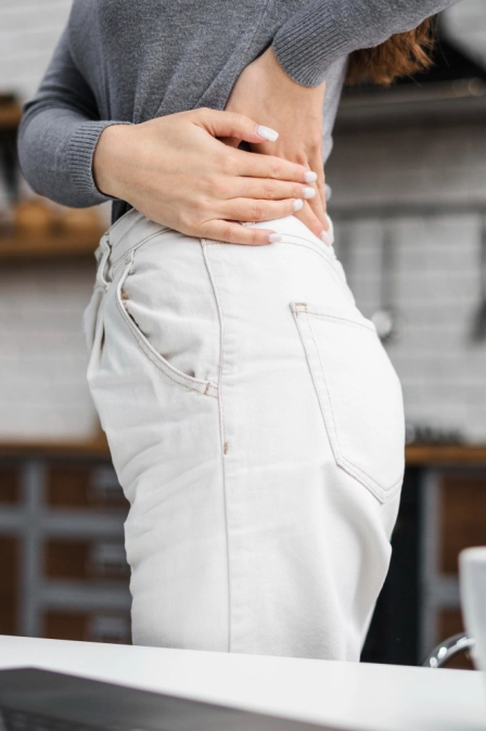 Люмбаго — это внезапная резкая боль («прострел») в пояснице, возникающая при поднятии тяжестей, неловком движении или охлаждении. Боль настолько интенсивная, что пациенту трудно двигаться.